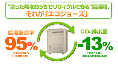 「エコジョーズ」は、ひとことで言えば「余った熱をおうちでリサイクルできる給湯器」です。