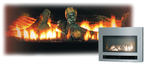 炎の揺らぎが上質な空間を演出する。ガス暖炉。